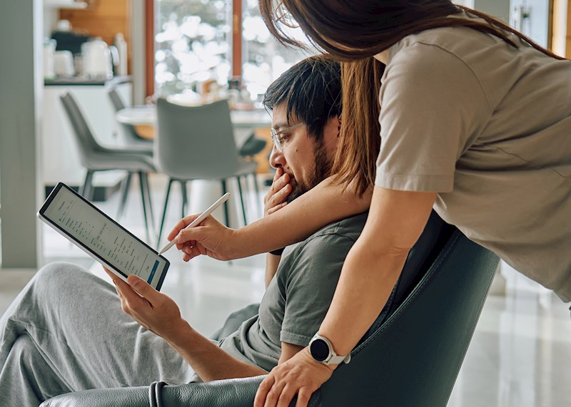 Someone holding a tablet in front of a computer screen